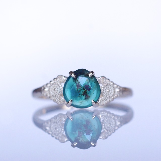 ジェムシリカのK10製、1点ものリングです。 クリソコラが珪化して透明度と強度が上がった「ジェムシリカ」。他にないグリーンカラーと透明度が魅力です。 ちょっと小ぶりなこのピースは深い海の色をさらに小さくギュッと集めたようなカラーの魅力があります。ブラックインクルージョンが鉱物の持つ魅力をかもしだし、宝石と鉱物の美しさを味わえるピース。 ※Youtubeに、製作者による音声付き紹介動画がございます。本ページWEB版をPCから御覧いただくか、Youtubeへアクセスして御覧ください。URL:https://youtu.be/u49aJJ05l5A デザイン: 【MALWA】東洋的イメージの荘厳な装飾と花をイメージにデザインしたシンプルな形の集合体のデザイン。可愛くもあり、大人の女性もずっと楽しんでいただける事と様々な形の天然石をバランスよく飾れるように生み出したデザインです。 素材:K10YG 石:ジェムシリカ 石サイズ:0.765ct 縦約6.8mm 横約6.5mm 高さ約2mm リングサイズ:#13 おサイズ直し可能です(#10〜#16程度の範囲が可能。3週間程度お時間をいただきます(イベントや年末年始、お盆休み等を含む期間はそれ+1週間程度)) ※それ以上の範囲のサイズ直しご希望の方も注釈ご了承の上で可能な場合が多いので是非お気軽にCONTACTからご連絡くださいませ。 ①備考欄にご希望サイズを明記下さい。 ②サイズ直し依頼(一律¥3,300)のご購入をよろしくお願いいたします。 *************************** ※実際のイメージが伝わる写真を撮影しておりますが、ご不明な点がありましたら、お問い合わせください。 ※PCとスマホ等ご覧になる環境によって色が異なって見える場合がございます。写真のホワイトバランスなどが実物とかけ離れすぎている場合はPCを基準に調整をしております。 ※店舗等イベント開催時は同時並行で出品しております。タイミングによってSOLDOUTとなりました場合はキャンセル対応させていただく場合がございますのであらかじめご了承くださいませ。 *************************** お手入れ方法: ジュエリーを永く美しく楽しむ為、ご使用にならない時は密封性のあるビニールパックなどでの保管がおすすめです。 汚れが気になる時は柔らかい布等でお手入れください。 *************************** ◆アフタークリーニングのご案内◆ 以前お迎えのaica作品のクリーニングをご希望の方は、いつでもご連絡ください。 ご連絡先⇒ info★aica-jewelry.com (“★”=”@”へ変更ください。必ず受信可能設定をお願いします) クリーニング自体は無償でさせていただきます。 ※往復送料(ヤマトの宅急便コンパクト指定)のみご負担ください。 ※百貨店イベントなどにお持込いただく場合も、直前で結構ですのでご一報下さい。 ※ご連絡時、折り返し送付先や免責事項などについてご案内させていただきます。 ***************************