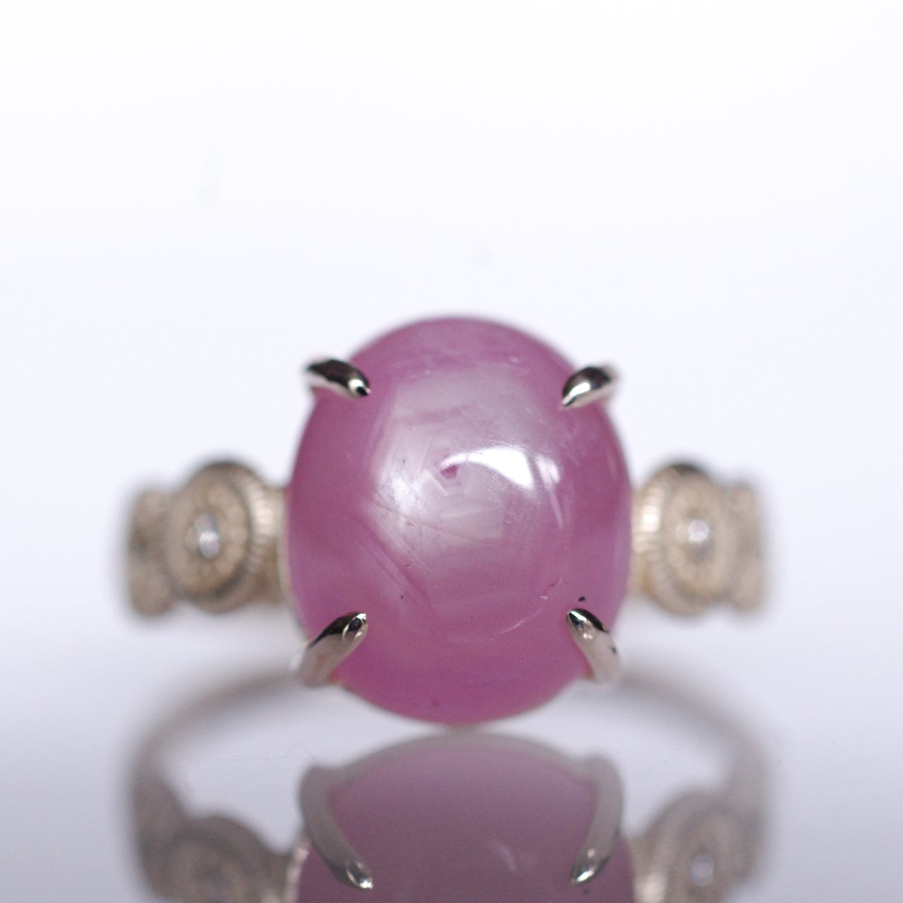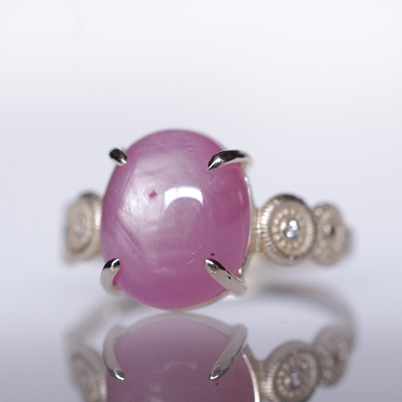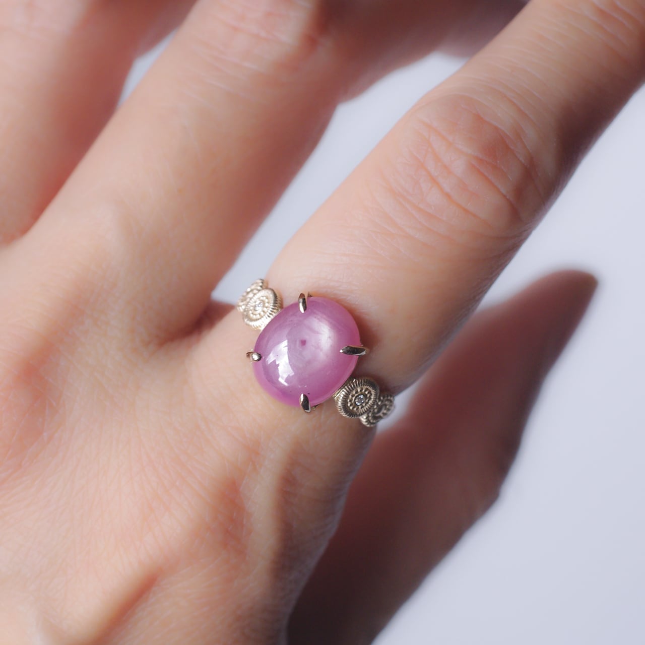 ふわっと光を感じるスタールビー。いわゆる「六条のスター」系ではない、優しく放たれる光だまりに心惹かれます。石自体に成長線の模様が見られ、これが薔薇のような乙女感があるのが魅力的。大き目のローズカラーだけど幅広い年齢層の方にバチっと似合う万能ピースです。