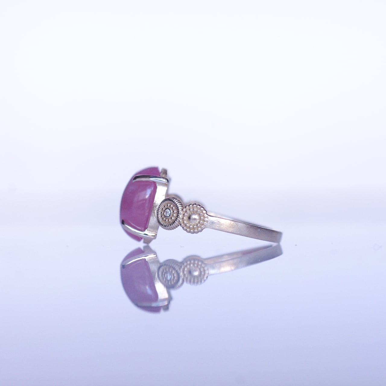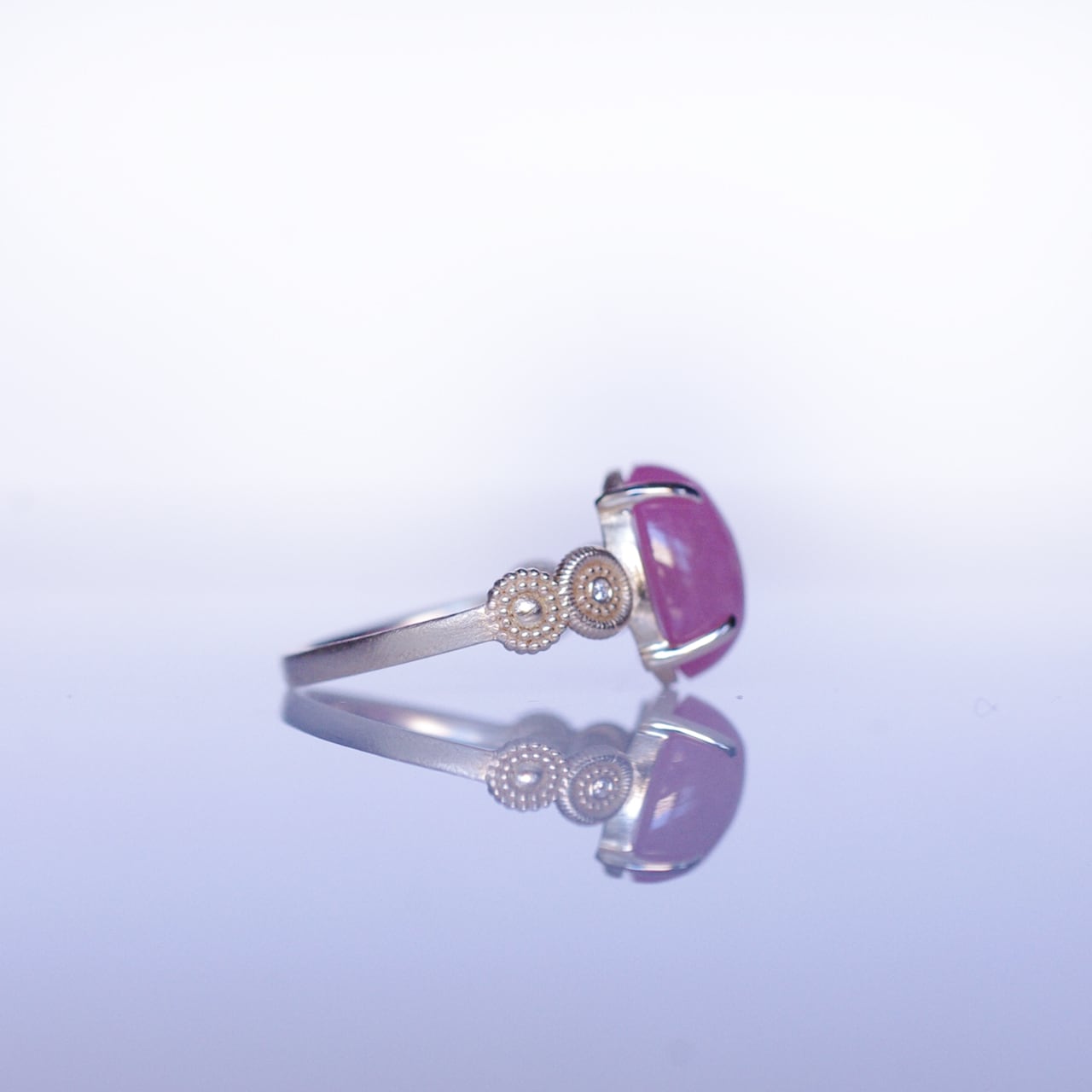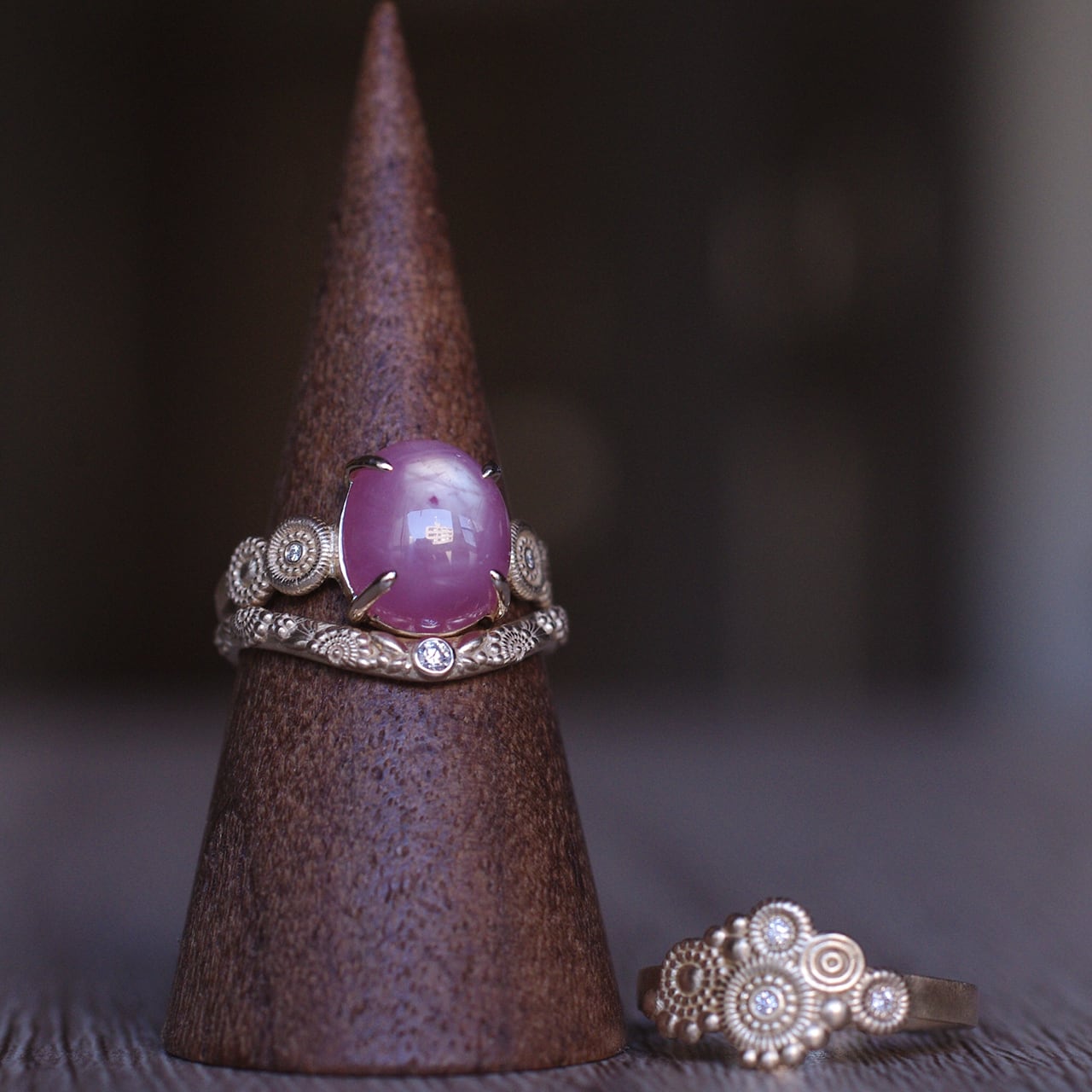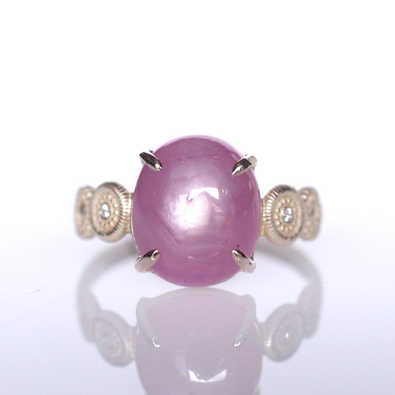 ふわっと光を感じるスタールビー。いわゆる「六条のスター」系ではない、優しく放たれる光だまりに心惹かれます。石自体に成長線の模様が見られ、これが薔薇のような乙女感があるのが魅力的。大き目のローズカラーだけど幅広い年齢層の方にバチっと似合う万能ピースです。