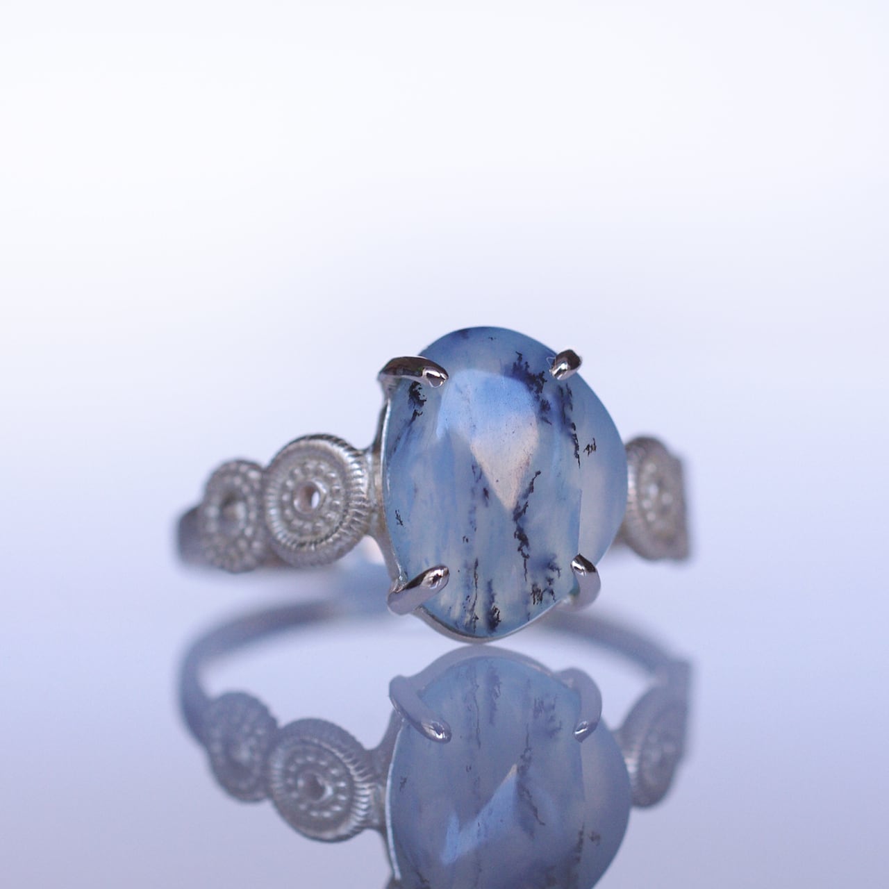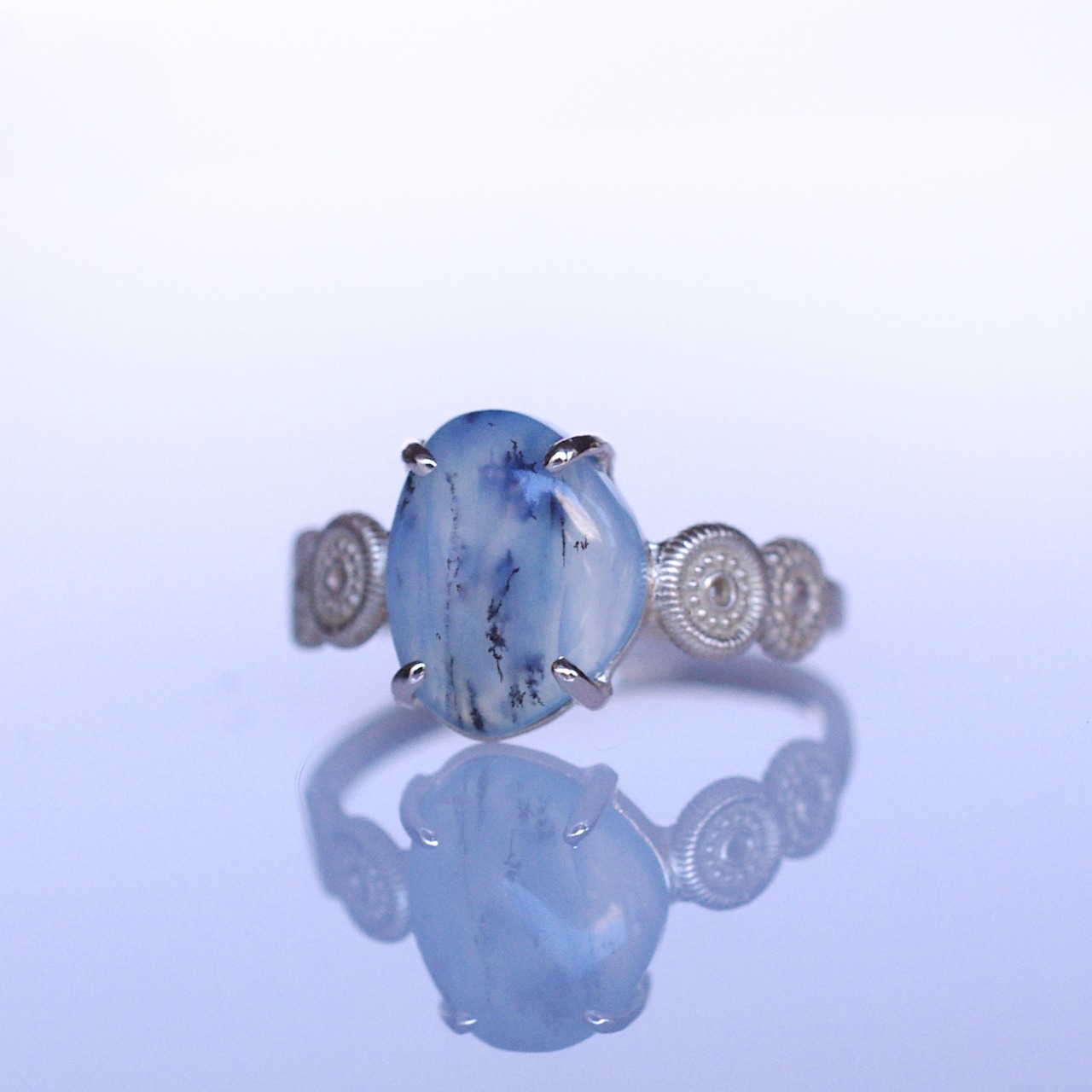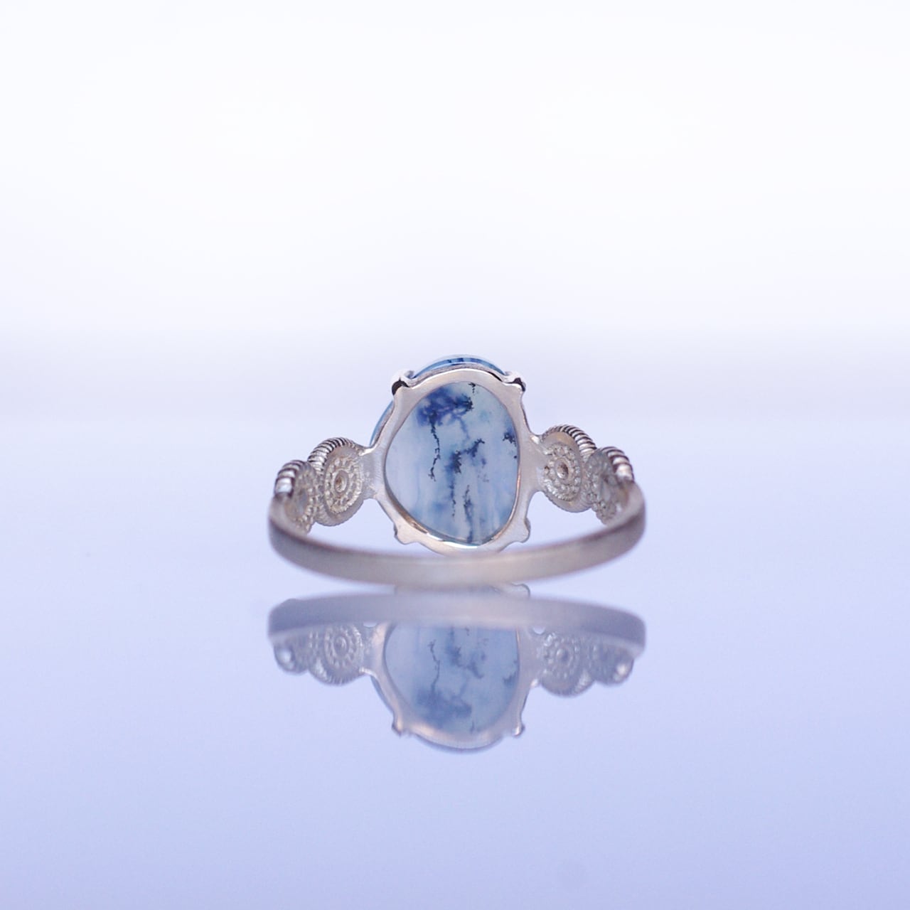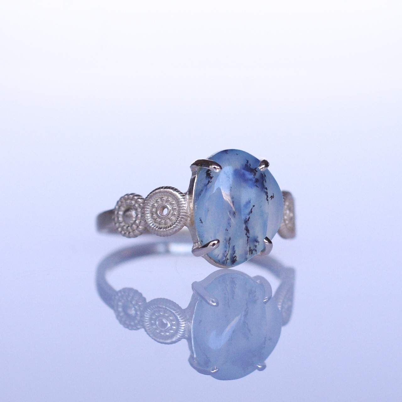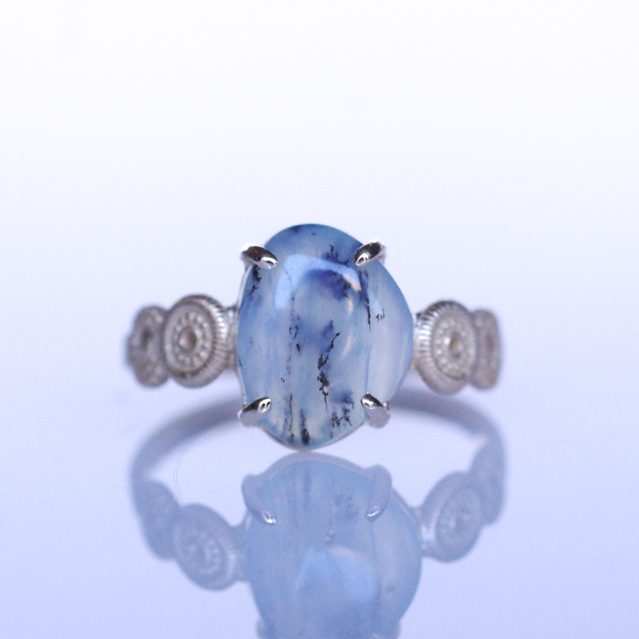 水墨画のようなデンドリティック模様がみられ、海の底のようなストーリー性を感じさせます。石の質感は軽くてセミマット。気負わず身に着けられる宝石の不思議な魅力。