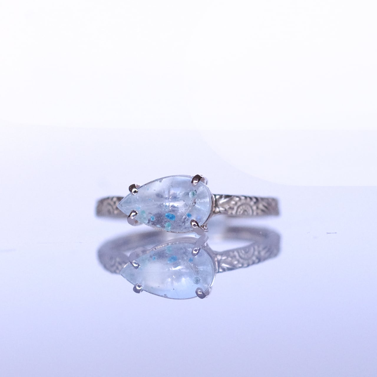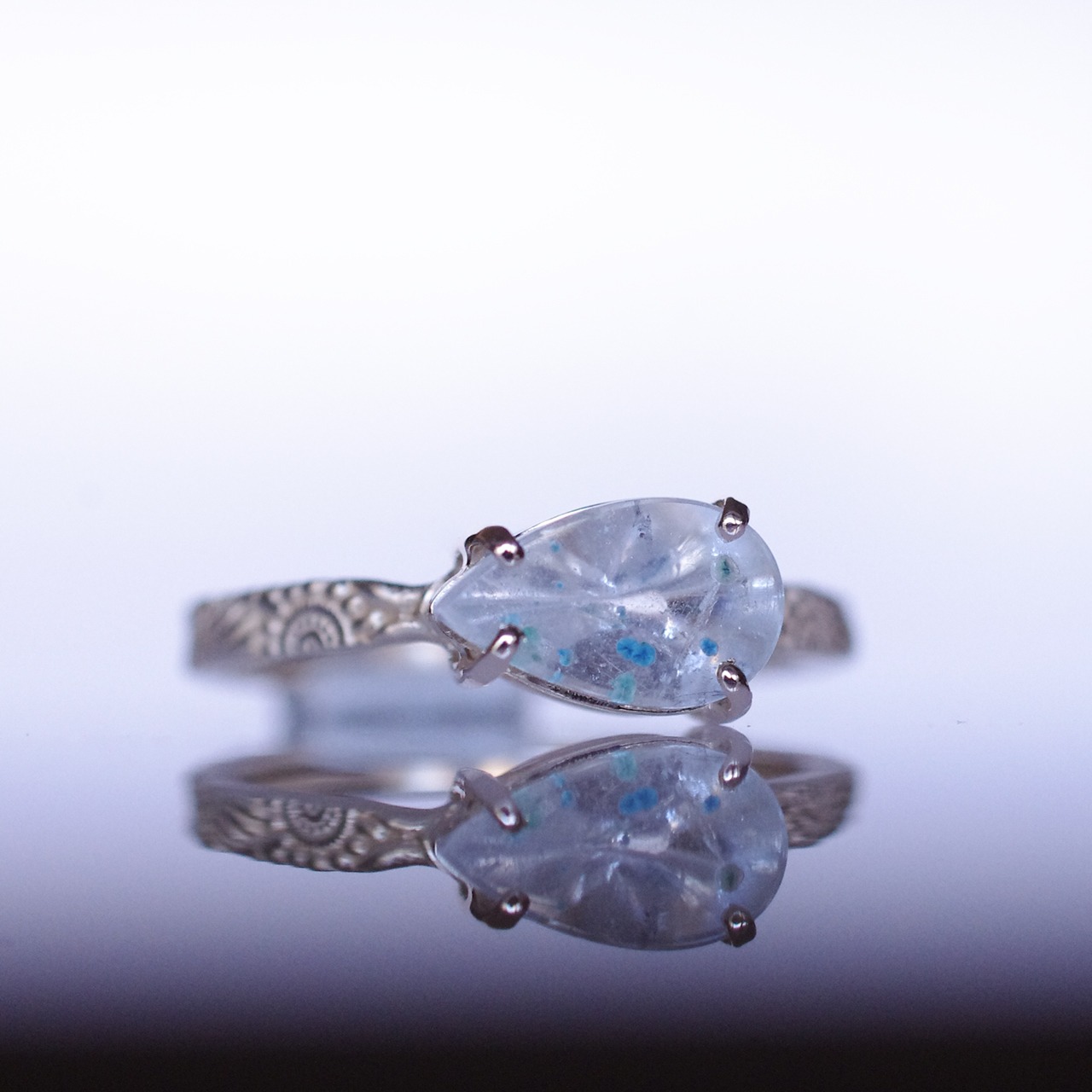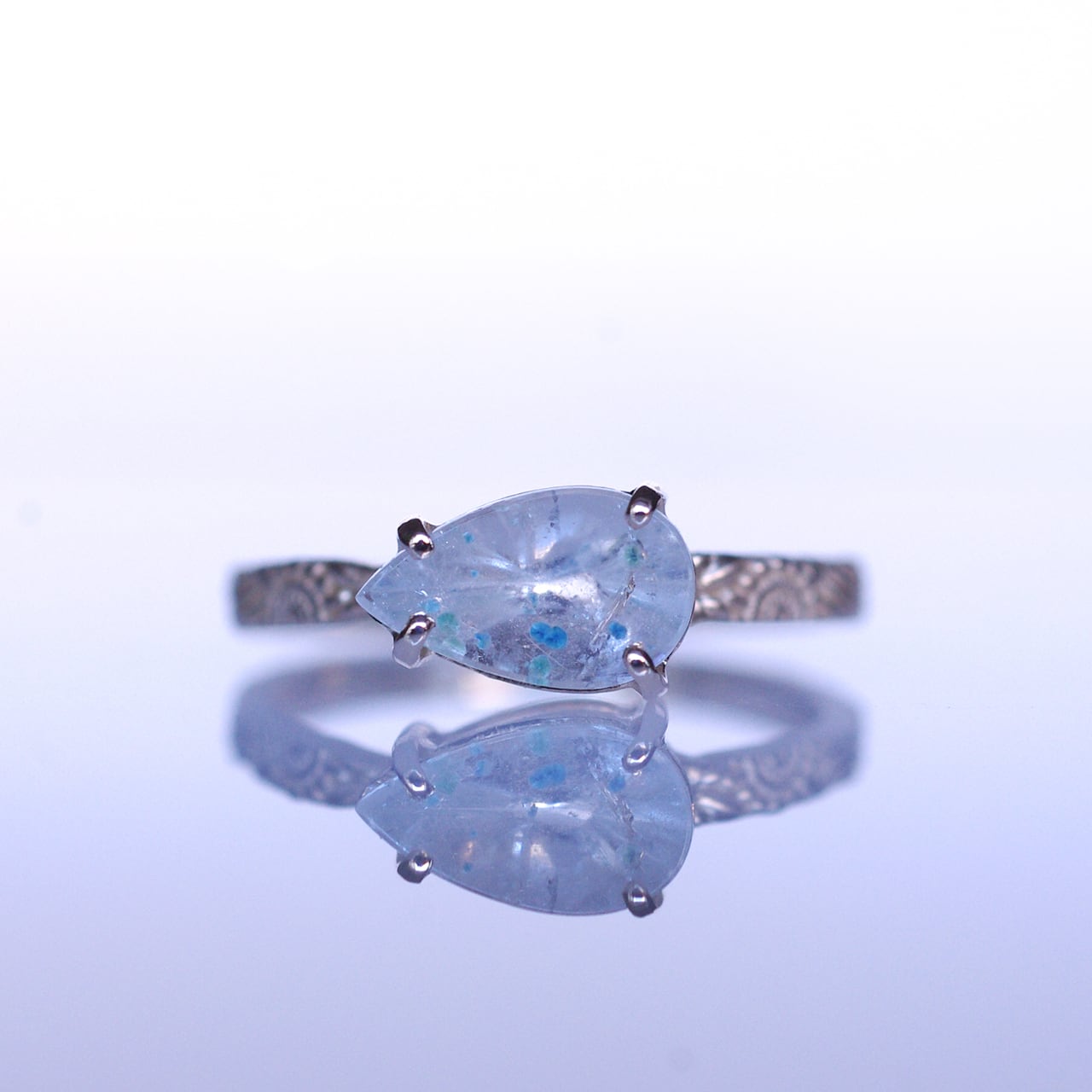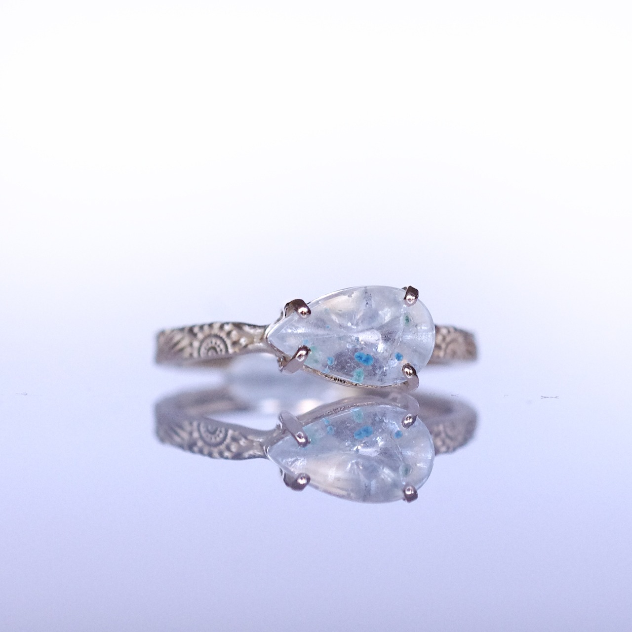 ブルーの水玉模様のように入るギラライトという鉱物が内包されているクォーツ。表面はフラット、ボトムはファセットカットが施されている事で、表面から広く取り入れた光をカットで反射させ、また広い面で返すというような独特の輝き方が魅力のピース。表面にカットが無い事で内包物もよく見えるので、なんとも良くできたカットのひとつぶなのです。