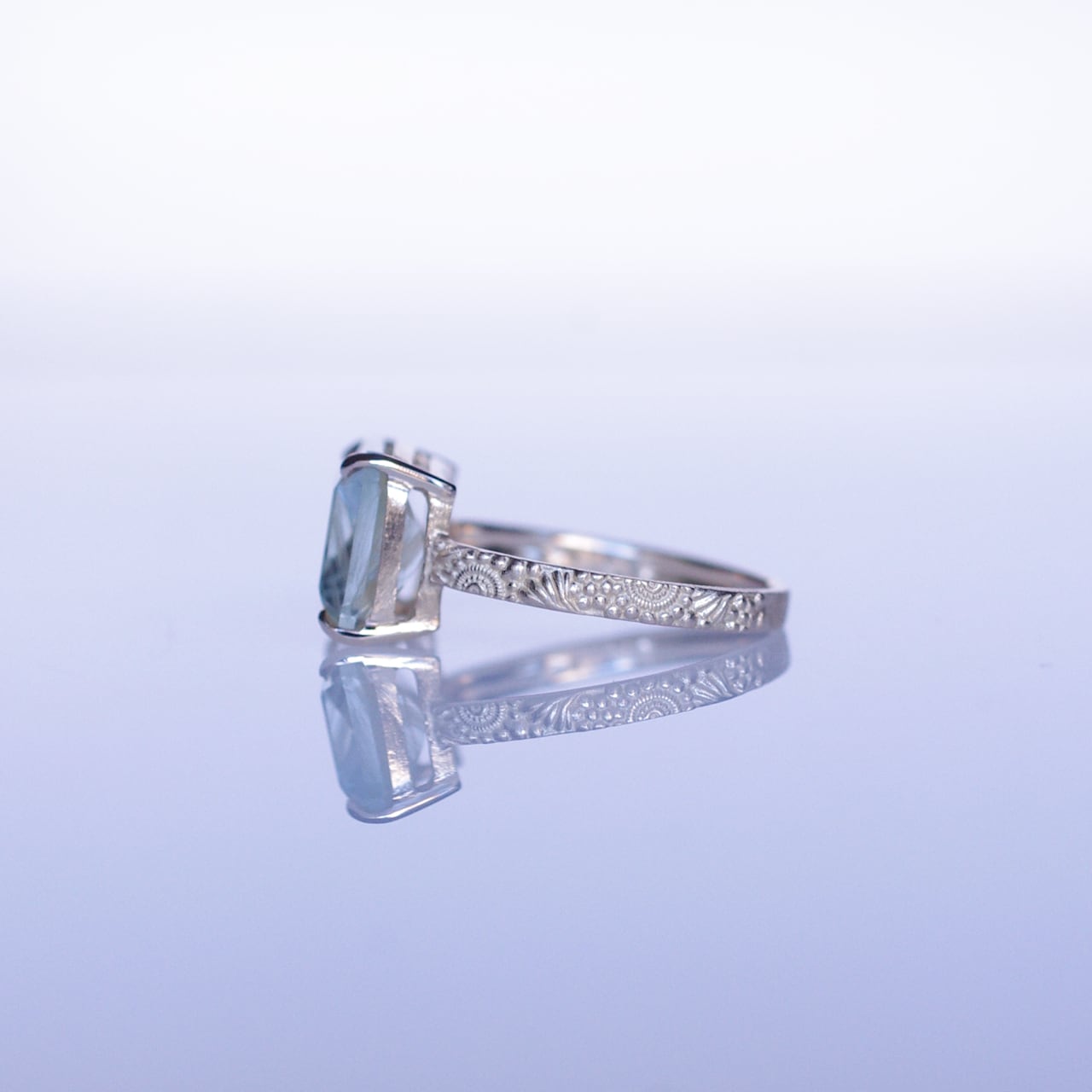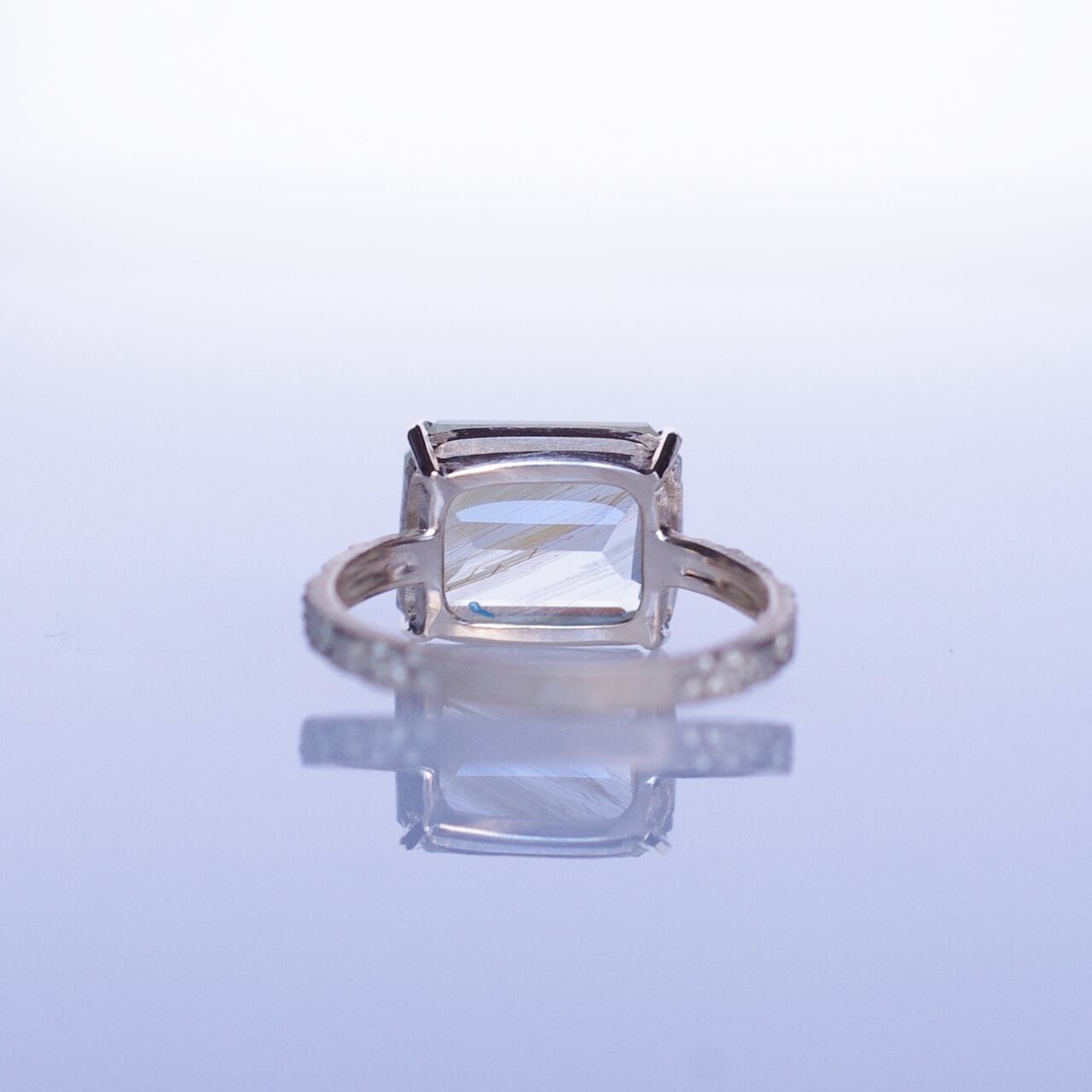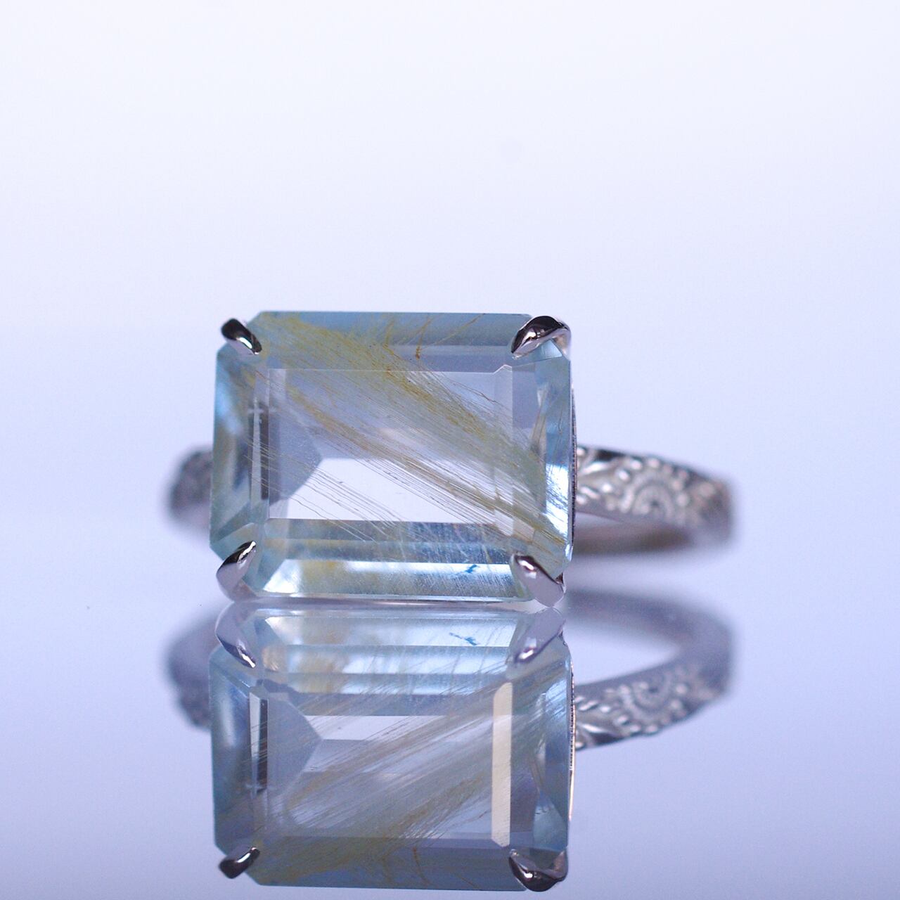 ガツンとおおぶりな宝石をつける楽しさを感じられる存在感。優しい、少しブルーがかったクリアカラーにファサっとしたインクルージョンが個性とマイルドさをプラスします。