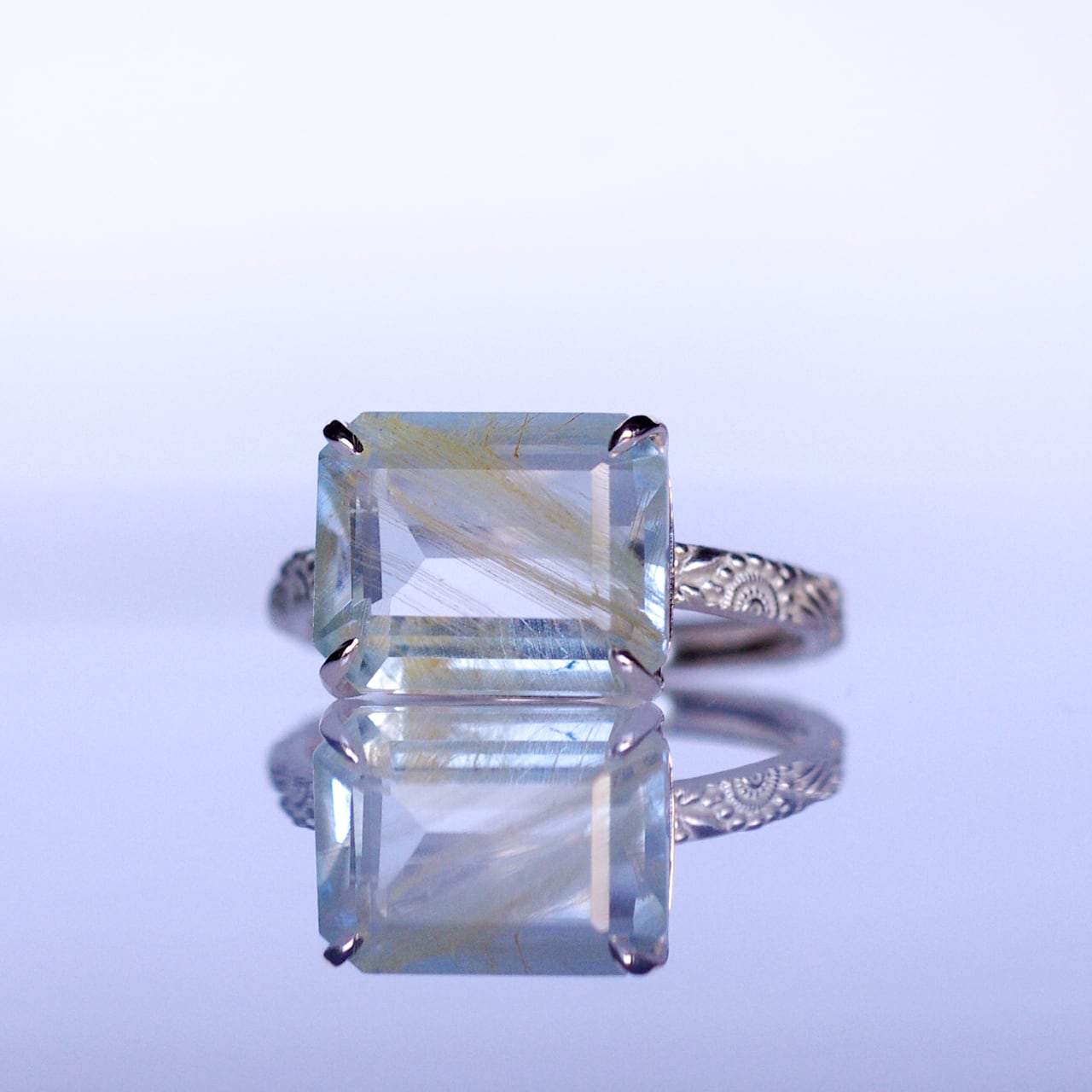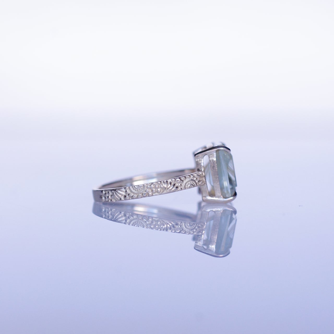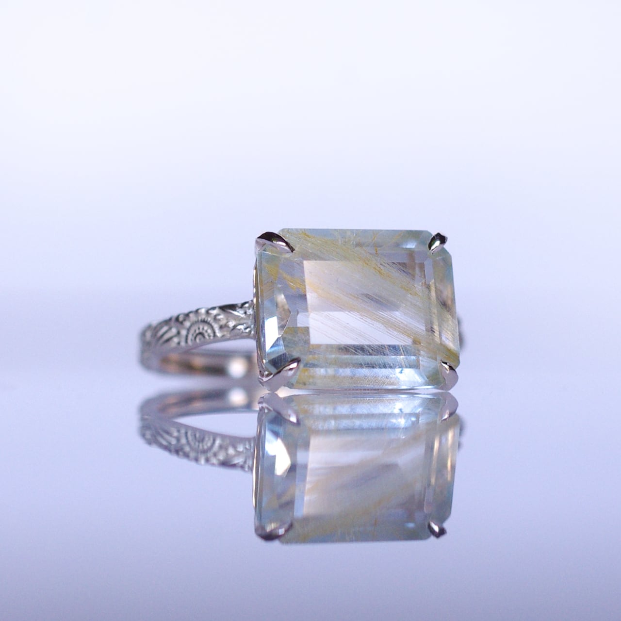 ガツンとおおぶりな宝石をつける楽しさを感じられる存在感。優しい、少しブルーがかったクリアカラーにファサっとしたインクルージョンが個性とマイルドさをプラスします。