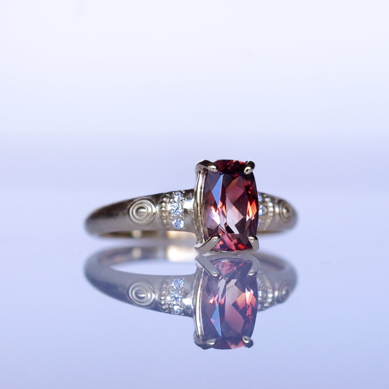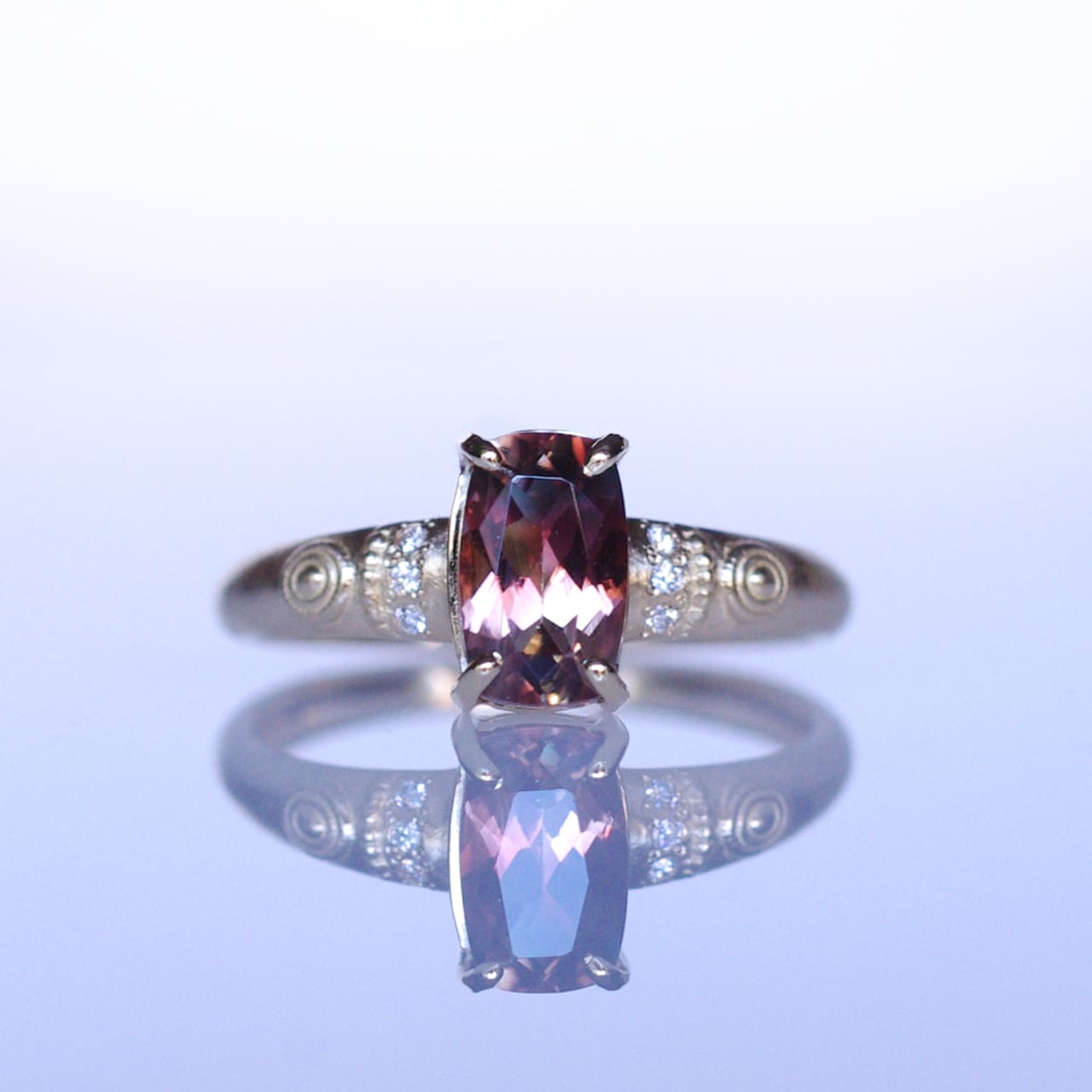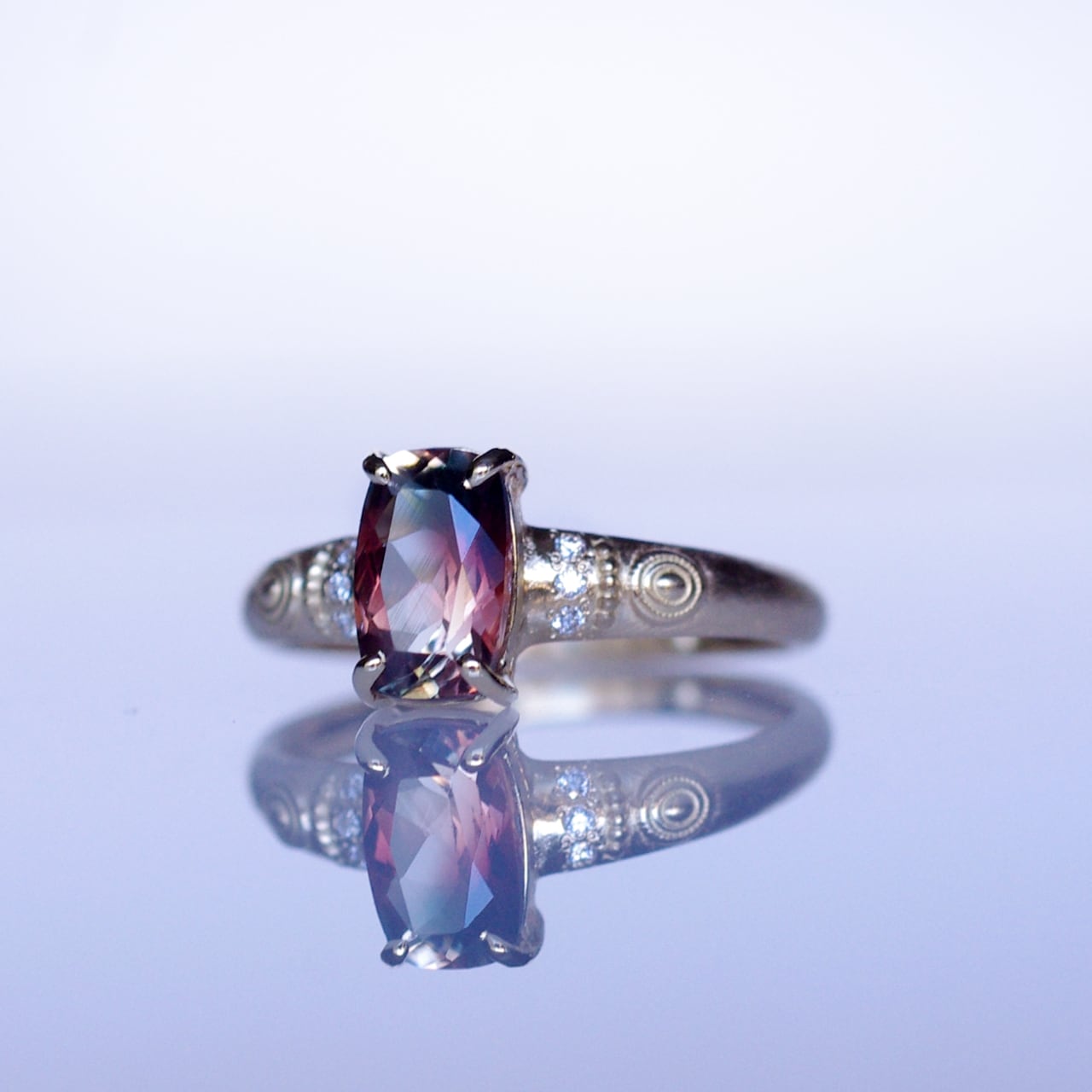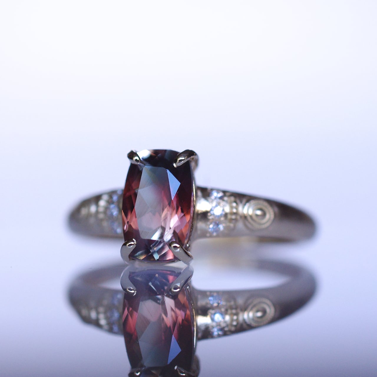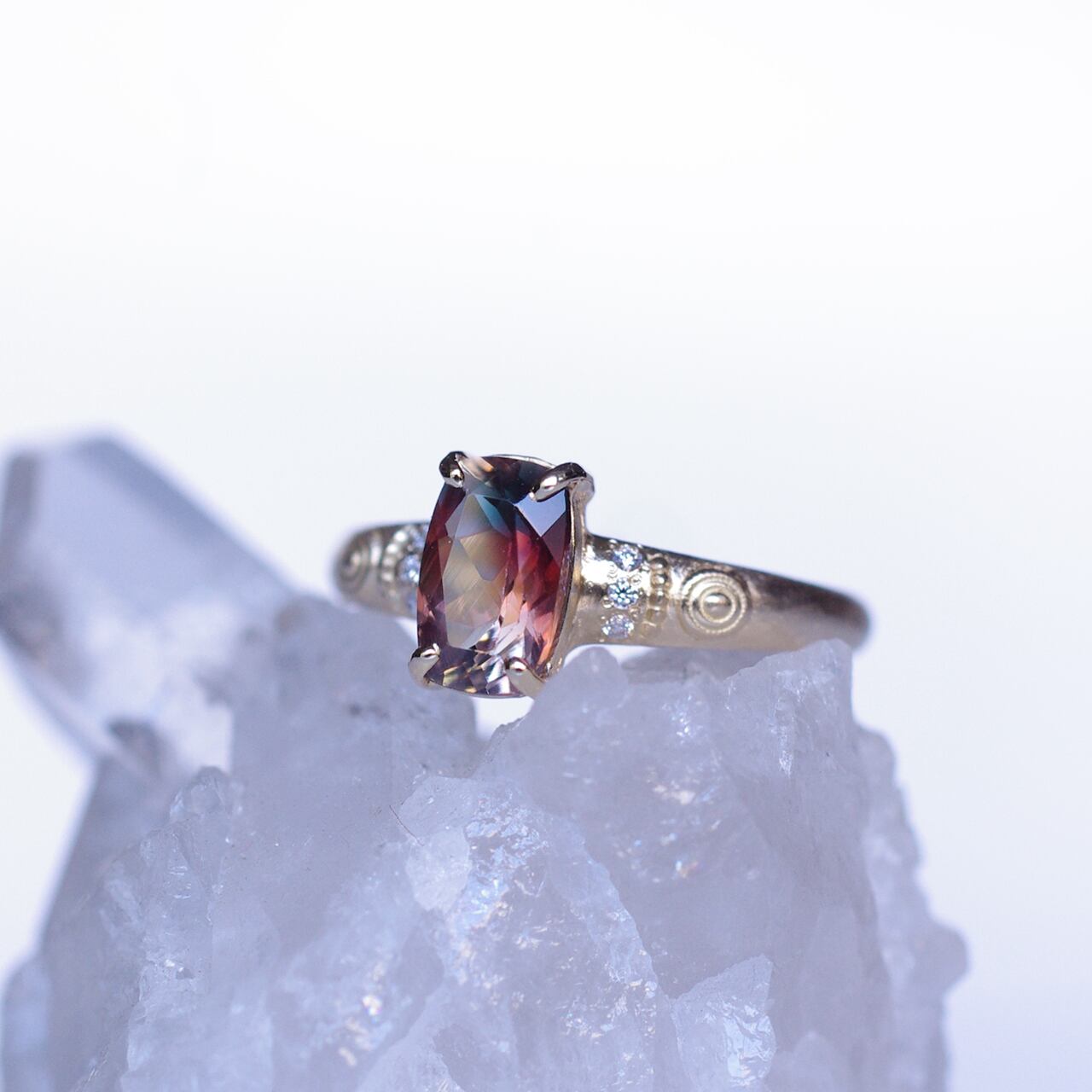 アームの両サイドに3石づつ連なるように留めたダイヤモンドの白さと煌めきが法輪をイメージした丸いラッキーモチーフとマッチしてエキゾチックな魅力が際立つようデザインしました。