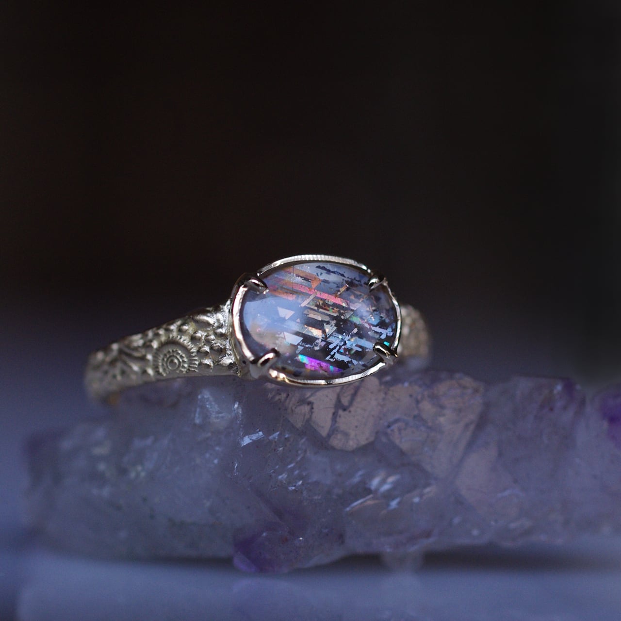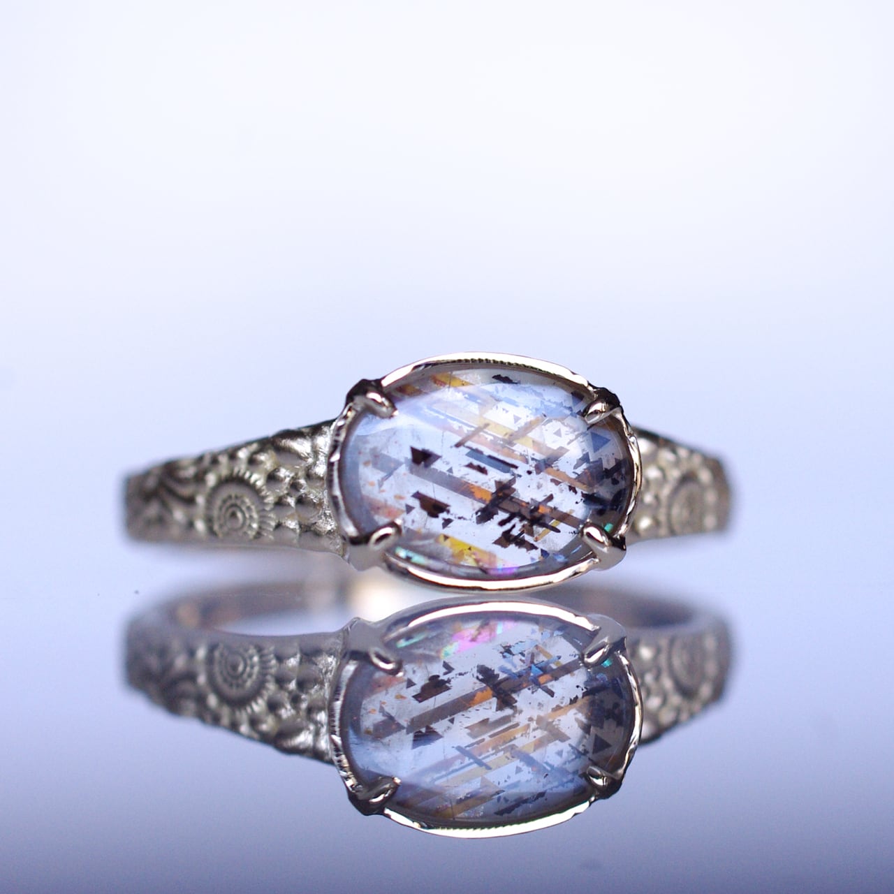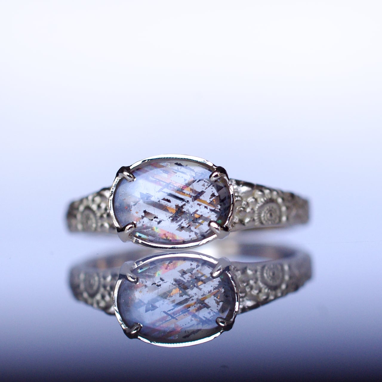 レインボーラティスサンストーンのK18製、1点ものリングです。
