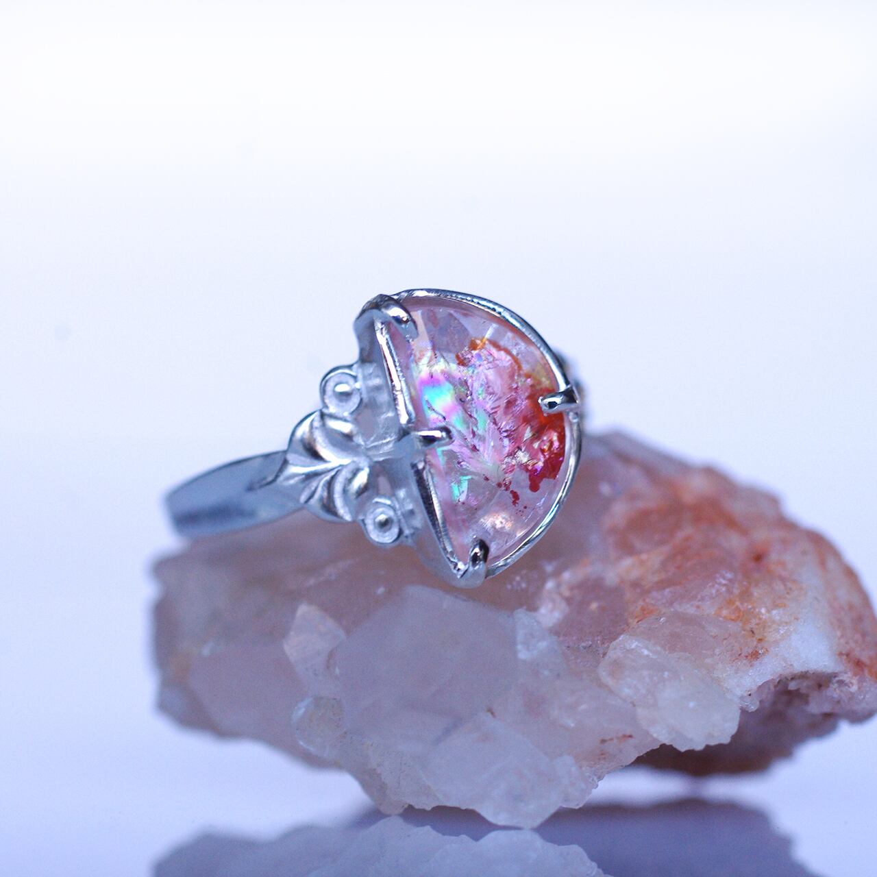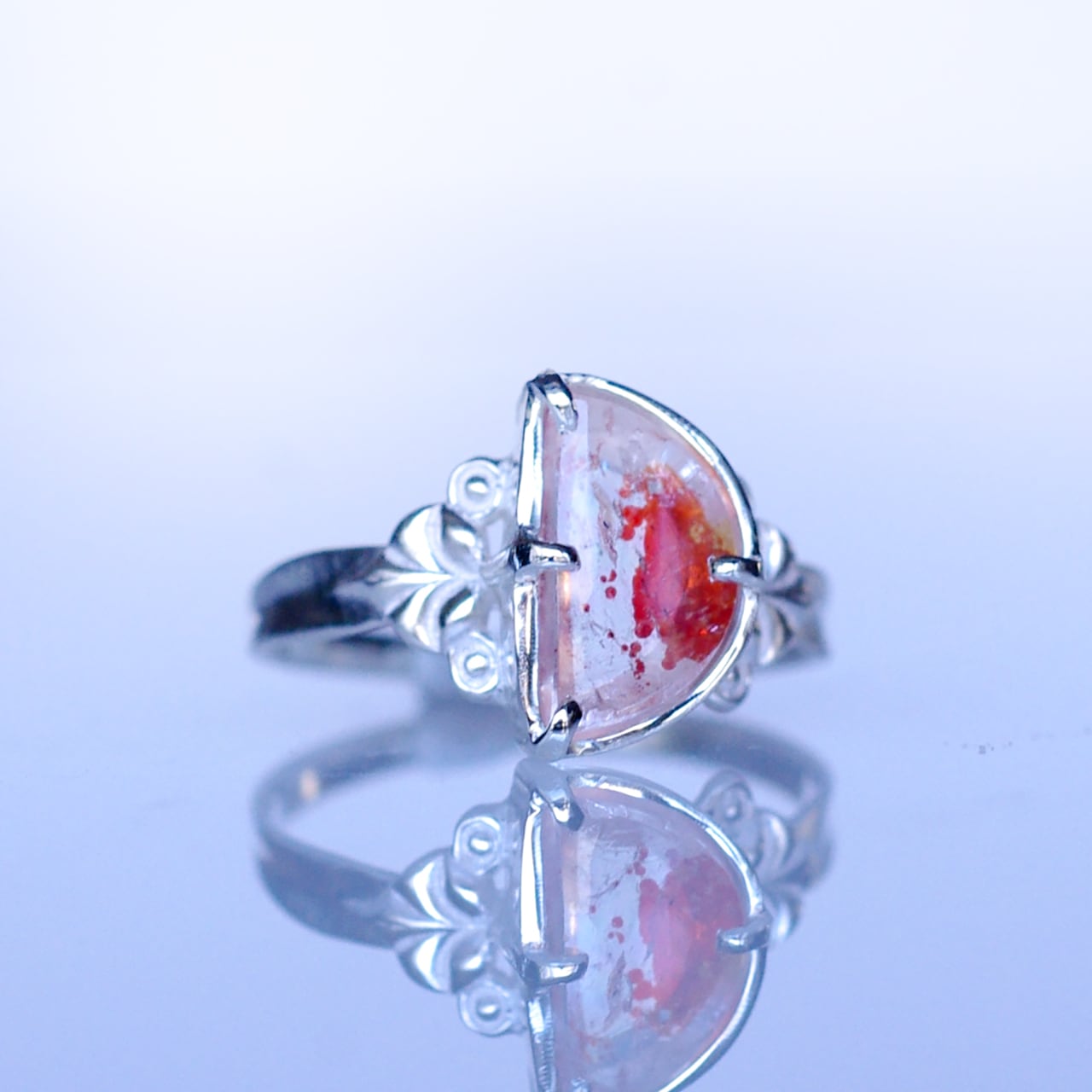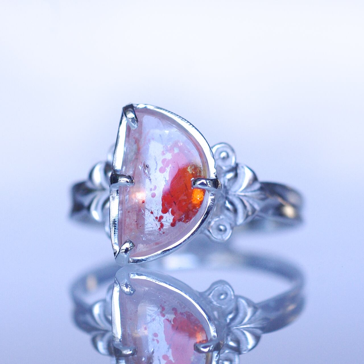 三日月形が個性的なヘマタイトインクォーツ。赤と黄色の内包物と周辺のフラクチャーによって見える虹のバランスが心惹かれるひとつぶ。