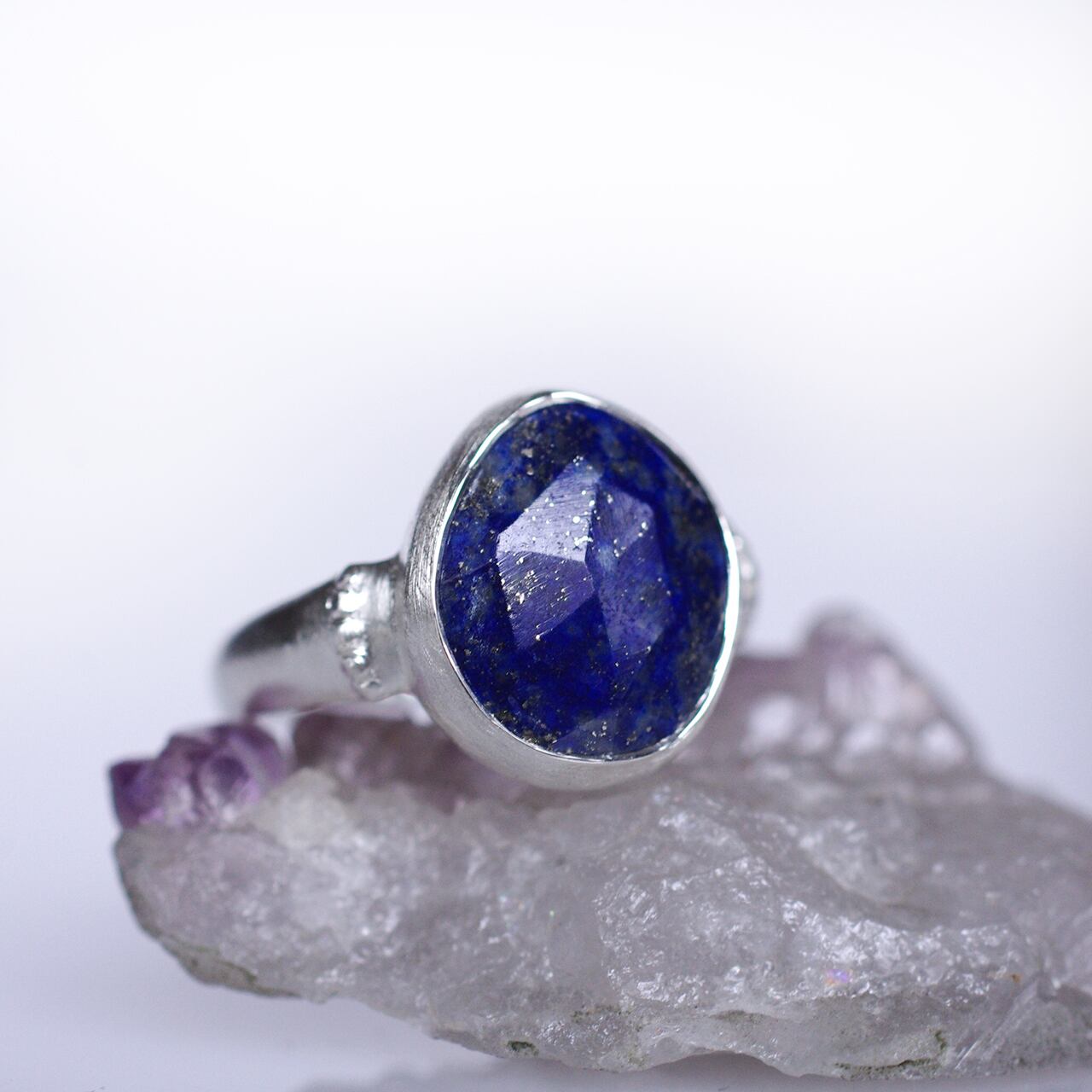 パイライト多めのキラキラゴールドが宇宙感を感じるラピスラズリのピース。深い紺色が美しいです。ローズカットが施されているので可愛さもあり、シンプルめなアームでつけやすいリングです。