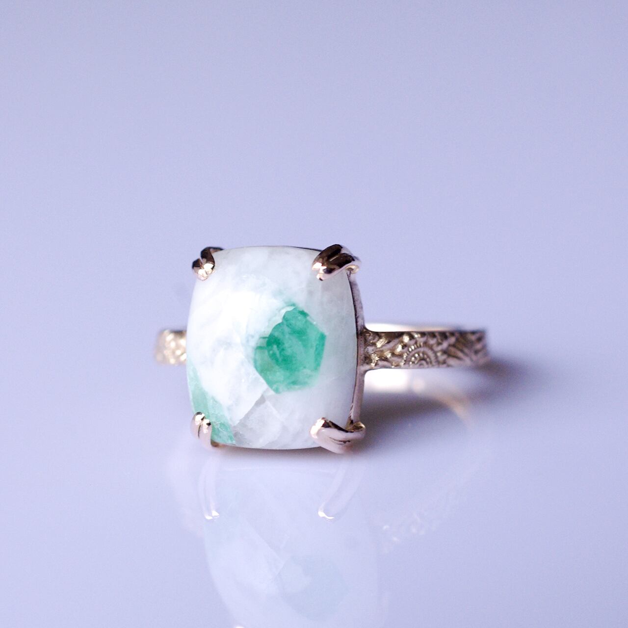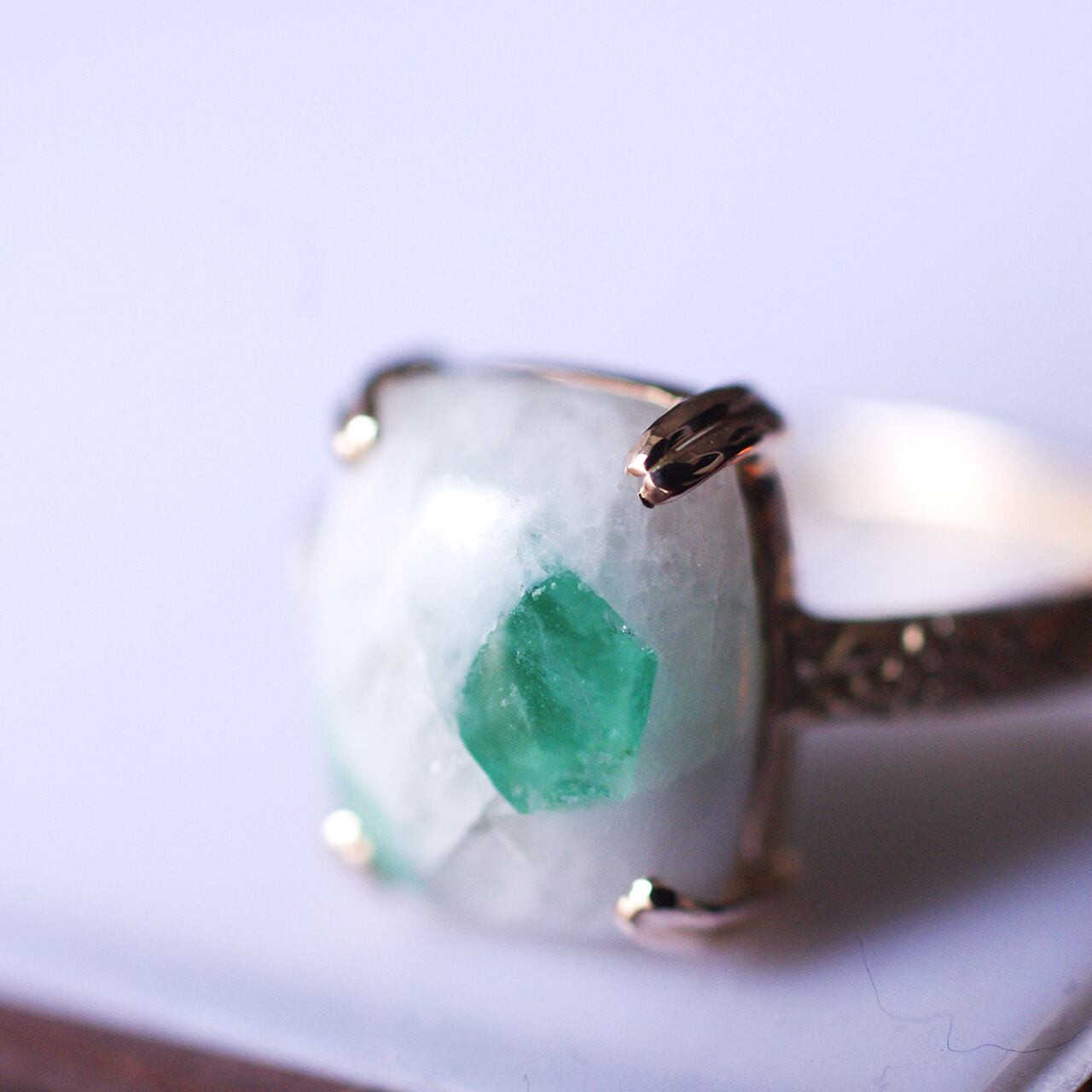 エメラルドの結晶がマトリックス(白い母岩)の中に入り込んでいる、アートピースのようなルース。